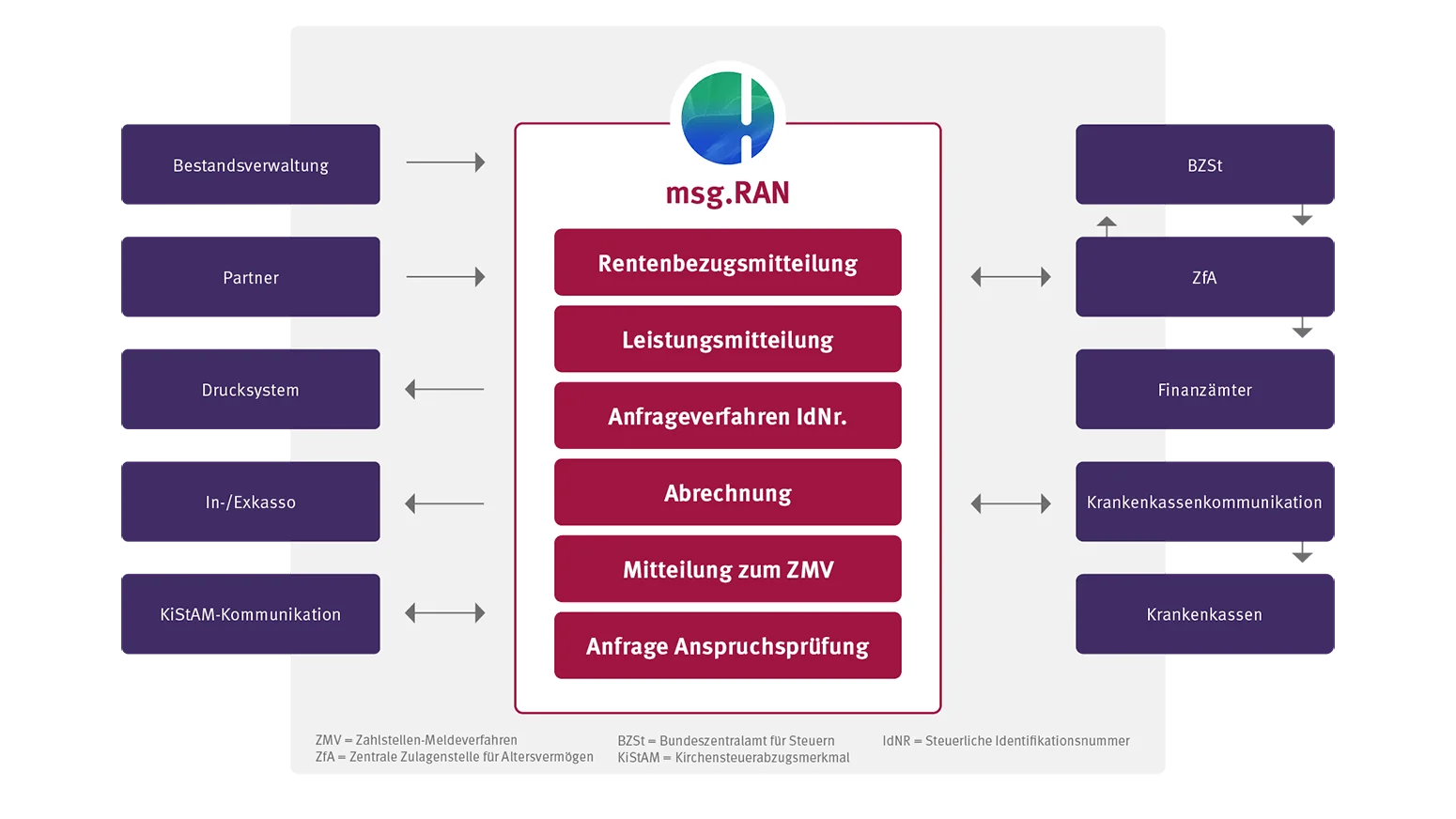 Mit msg.RAN können Versicherer und Versorgungsträger sämtliche Prozesse der Rentenzahlungen aus Rentenversicherungen und Altersvorsorgeverträgen einschließlich der Abführung von Kranken- und Pflegeversicherungsbeiträgen sowie von Kapitalertragsteuer, Kirchensteuer und Solidaritätszuschlag effizient verwalten und protokollieren. Zusätzlich erzeugt msg.RAN gesetzlich vorgeschriebene Nachweise.