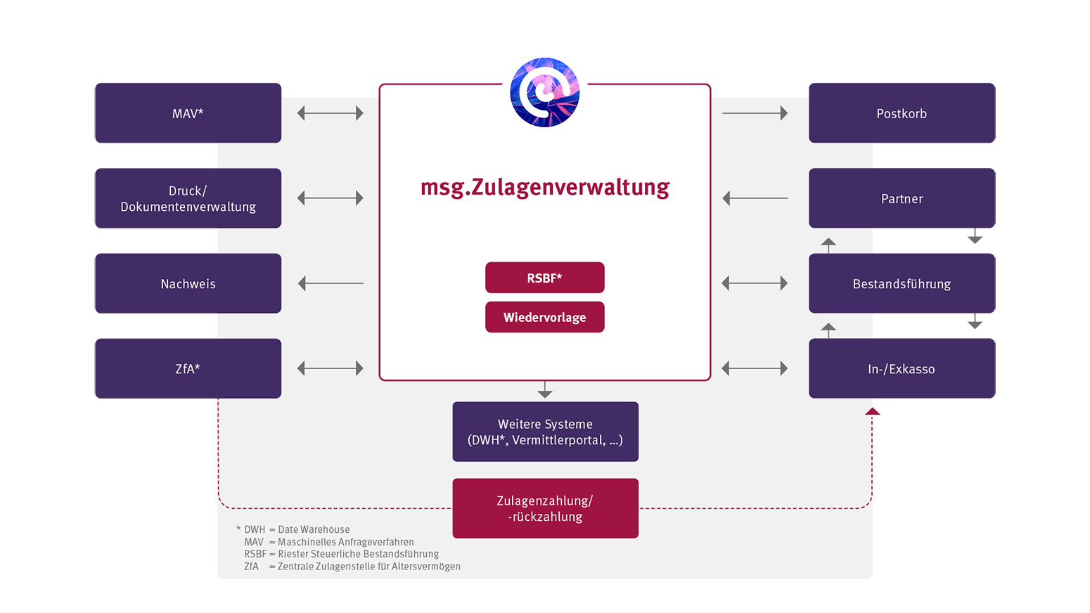 Die msg.Zulagenverwaltung ist eine Standardsoftware für die automatisierte Verarbeitung der Zulagenprozesse von Riester-Produkten.
