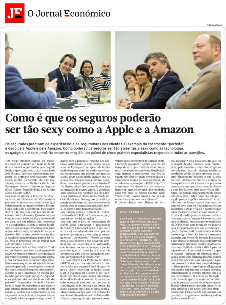 “Da visão product-centric ao modelo customer-centric” é o tema de fundo de um encontro promovido pela msg life Iberia e que conta com a participação de José Burgos, business development manager da entidade organizadora; Nuno Costa, diretor na MetLife; de Rita Travassos, diretora na Médis/Ocidental; de Emmanuel Lesueur, diretor na Seguradoras Unidas/Tranquilidade; e de Sandra Moás, CEO na ASISA.