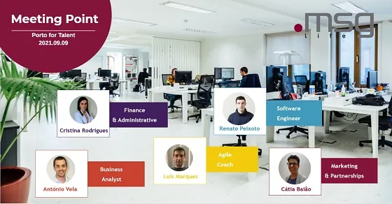 No âmbito da Porto. for talent, a 9 de setembro dinamizámos um Meeting Point digital onde contámos com o contributo de diferentes colaboradores da msg life Iberia – António Vela, Business Analyst; Cátia Baião, Marketing & Partnerships Manager; Cristina Rodrigues, Finance & Administrative Specialist; Luís Marques, Agile Coach e Renato Peixoto, Software Engineer – para dar uma visão do seu contributo e dia a dia de trabalho na atividade da empresa.